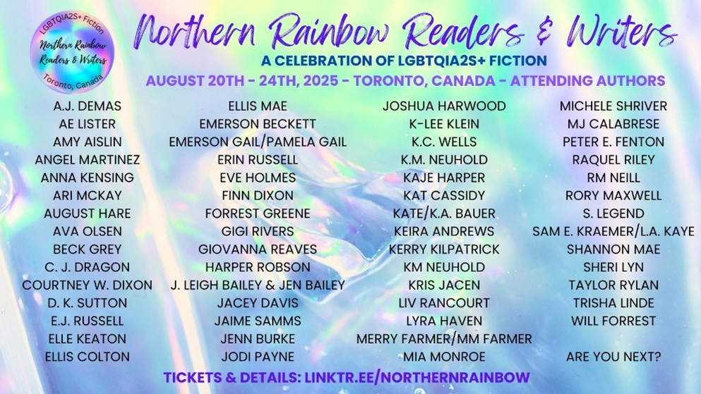 I’ll be in Toronto again for the event. The name has changed slightly—it’s now Northern Rainbow Readers and Writers—and it will be from August 20 to 24, 2025.